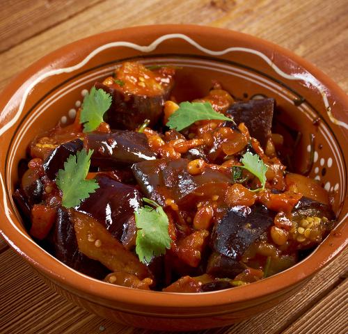 - Add eggplant, tomatoes, beans, green chiles, spices and water.