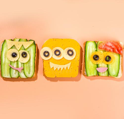 - Arrange pepper strips to make eyebrows/eyes, nose and a smiling mouth. Use cheese for hair. (Your kids might like to do this part.)