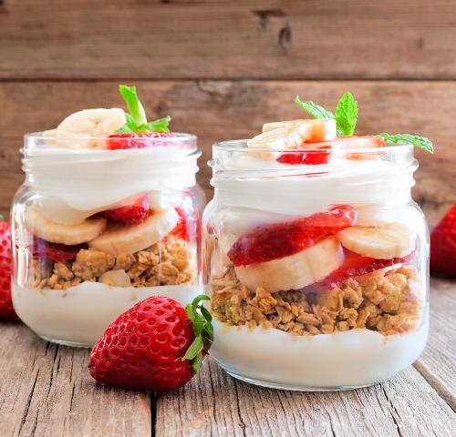 - To make the parfait, spoon 1 tablespoon of yogurt into the bottom of an 8-ounce glass. Top yogurt with 1 tablespoon sliced bananas, 1 tablespoon sliced strawberries, and ¼ cup graham crackers.
